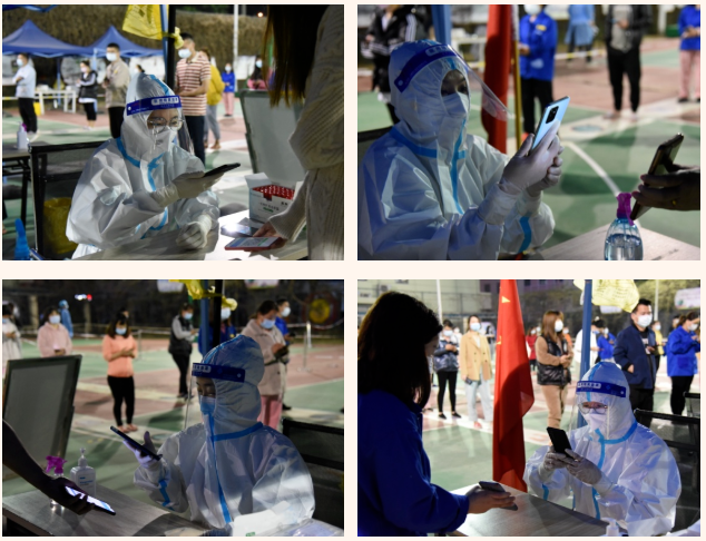 核酸采樣登記是核酸檢測工作中的重要一環(huán)。采樣登記處的“大白”根據采樣要求,以10人混檢為單位一一完成掃碼登記,仔細核對檢測人員信息。在封控的宿舍內,“大白”身披改裝挎包,一邊維持著現場秩序,一邊協助醫(yī)護人員掃碼登記,全力當好醫(yī)生“好幫手”。